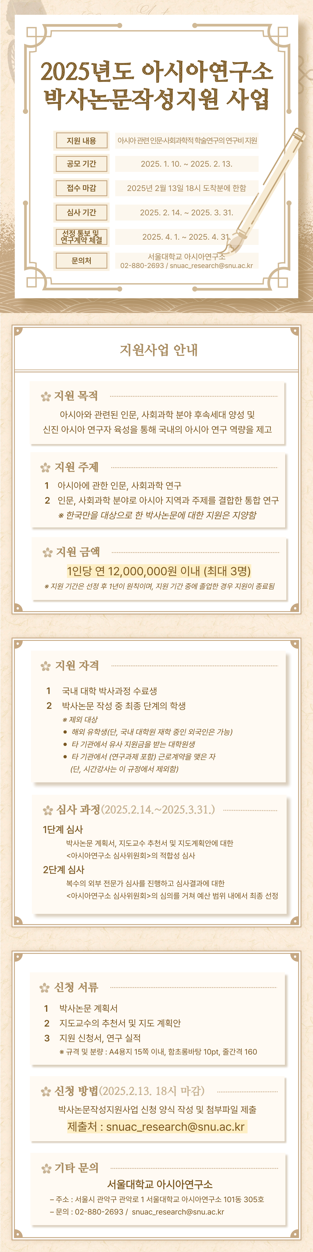 아시아와 관련된 인문, 사회과학적 학술연구를 중점적으로 지원하기 위한 <2025년도 아시아연구소 박사논문작성지원 사업>을 안내드립니다.